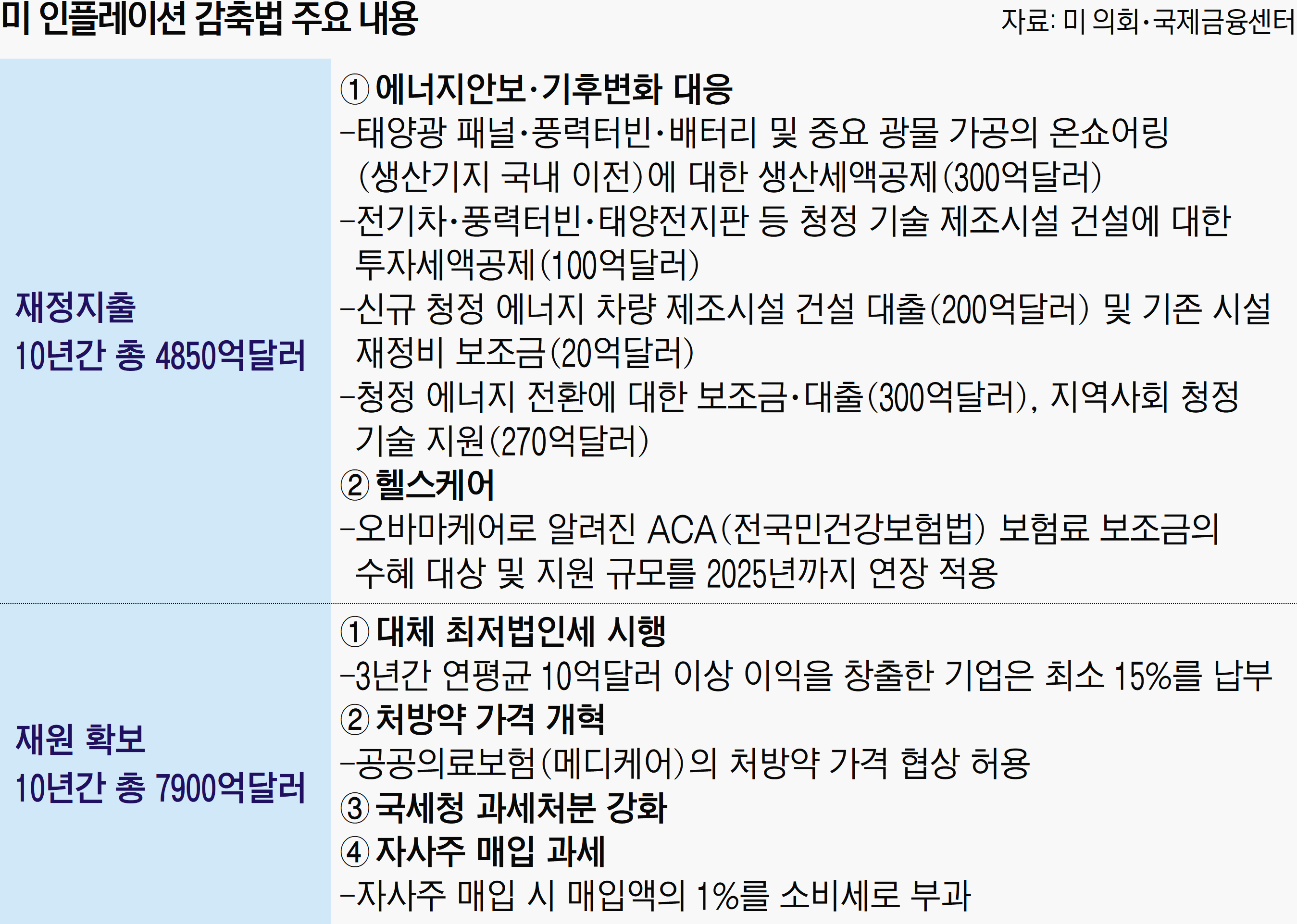 지난 12일(현지시간) 미 하원을 통과한 IRA는 향후 10년 동안 4850억달러(약 633조4100억원)를 투입해 에너지 안보와 기후변화 대응, 헬스 케어에 집중 투자하는 내용을 담고 있다.