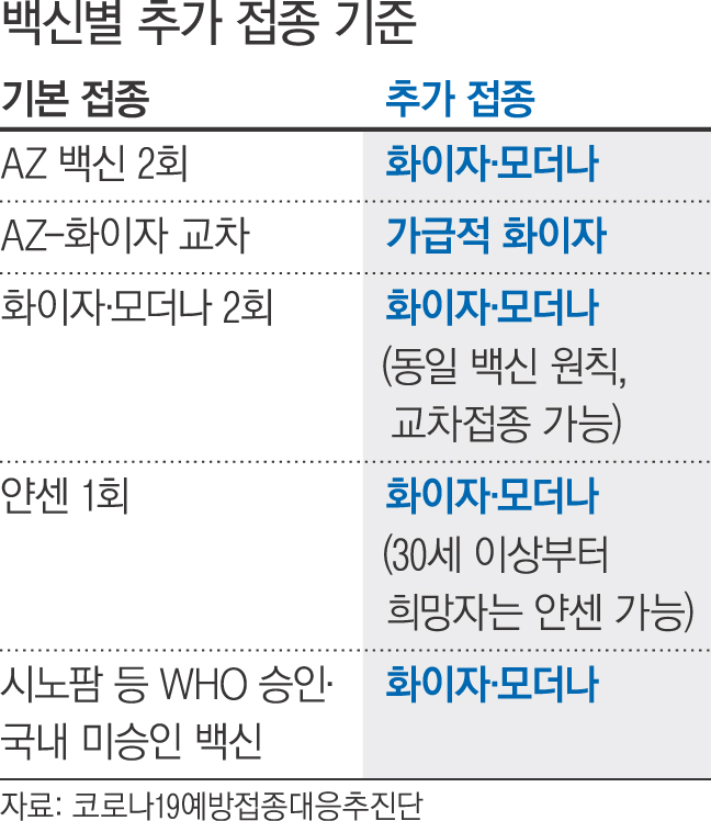 다음달부터 코로나19 백신 추가접종(부스터샷) 대상이 얀센 백신 접종자, 50대 연령층, 기저질환자, 우선접종 직업군으로 넓어진다.