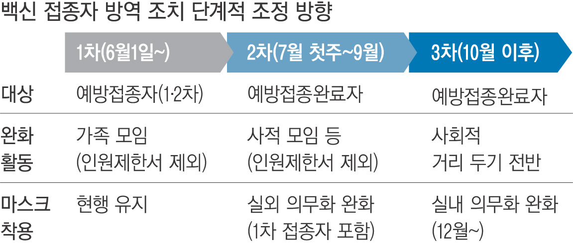 7월부터 1차 접종자가 야외에서 2m 거리 두기에 상관없이 마스크를 벗을 수 있게 한 조치는 예상보다 과감하다.