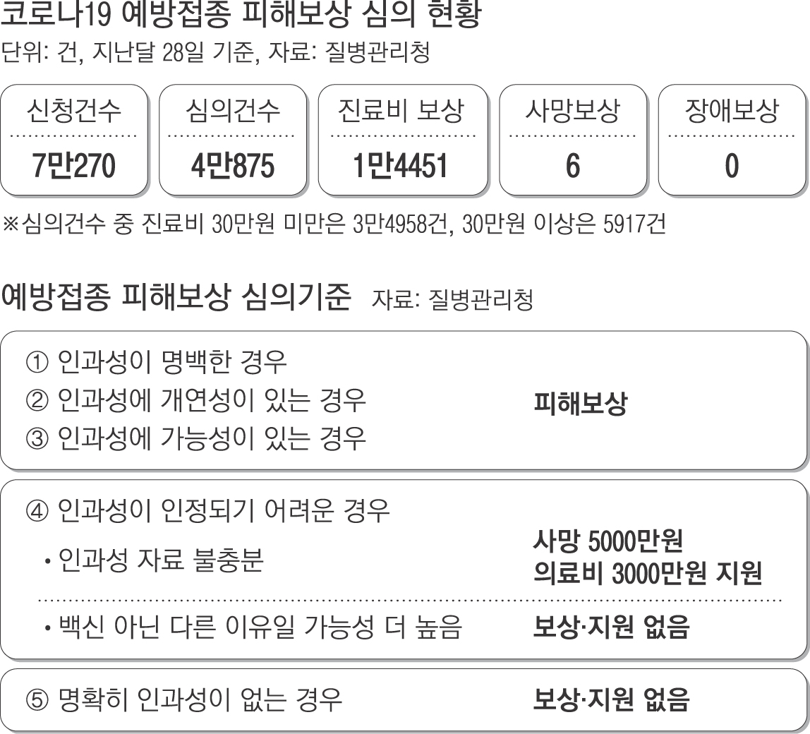 방역당국이 코로나19 백신으로 인한 피해를 너무 보수적으로 인정한다는 비판이 나오면서 최근엔 판단 기준의 틀을 바꿔야 한다는 주장이 제기되고 있다.