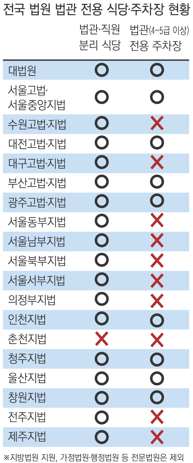 판사 전용 주차장을 운영하고 있는 법원도 절반 가까이 됐다. 공공기관 대부분에서 간부식당을 폐지했는데 법원만 이러한 관행을 유지하는 것이다.