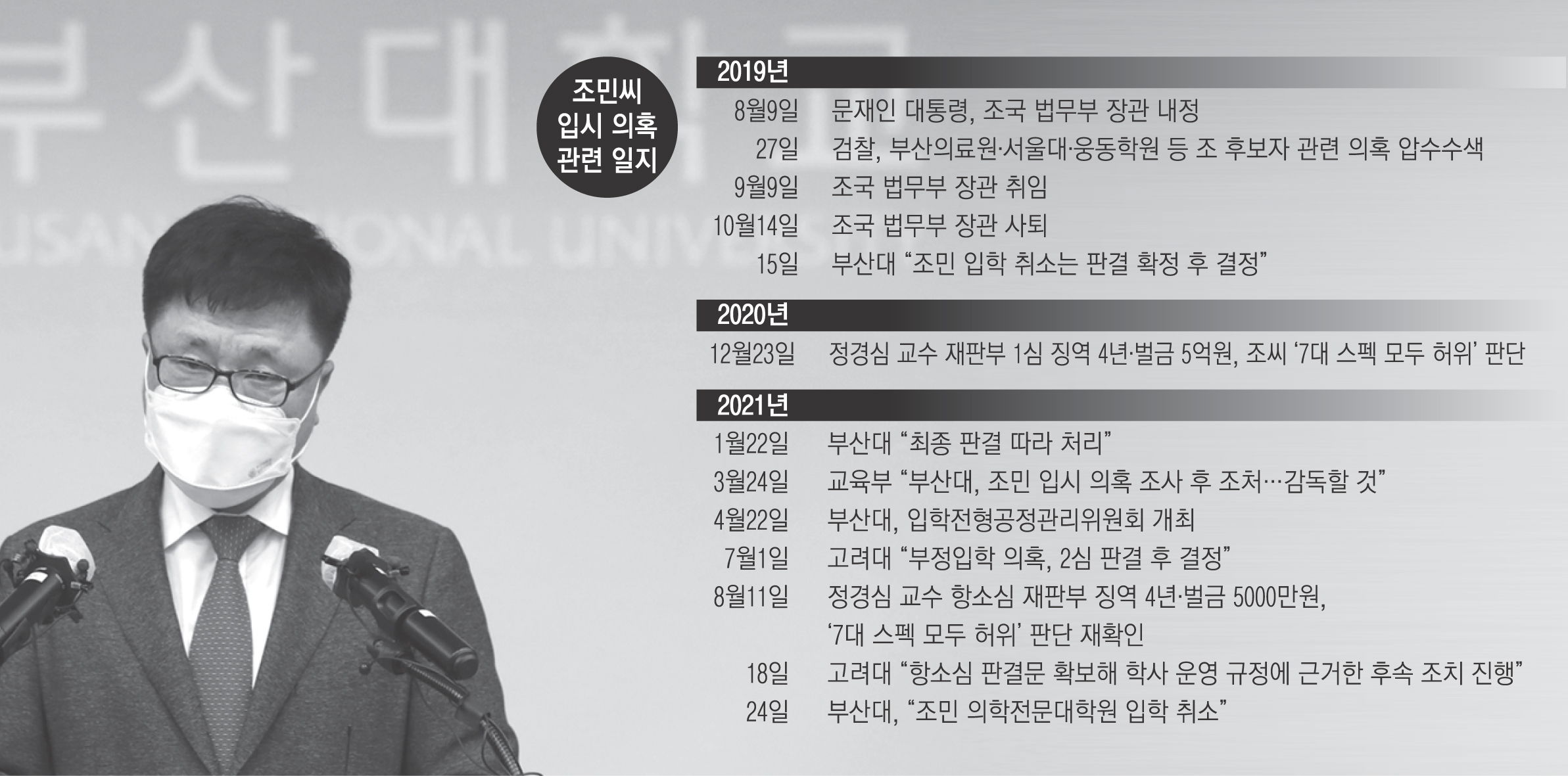부산대는 24일 오후 기자회견을 열고 입학전형공정관리위원회 ‘자체조사 결과서’와 조 전 장관의 부인인 정경심 동양대 교수의 항소심 판결, 소관 부서의 의견을 종합적으로 검토한 결과 조씨의 2015학년도 의전원 입학을 취소하기로 결정했다고 밝혔다.