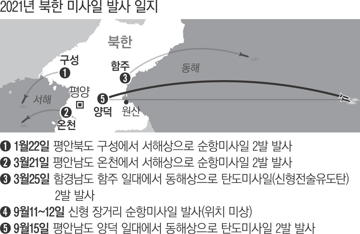 북한이 장거리 순항미사일 시험발사를 발표한 지 이틀 만인 15일 단거리 탄도미사일을 동해상으로 쏜 것은 계획대로 무기체계 고도화 목표를 달성하려는 의지를 보여준다.