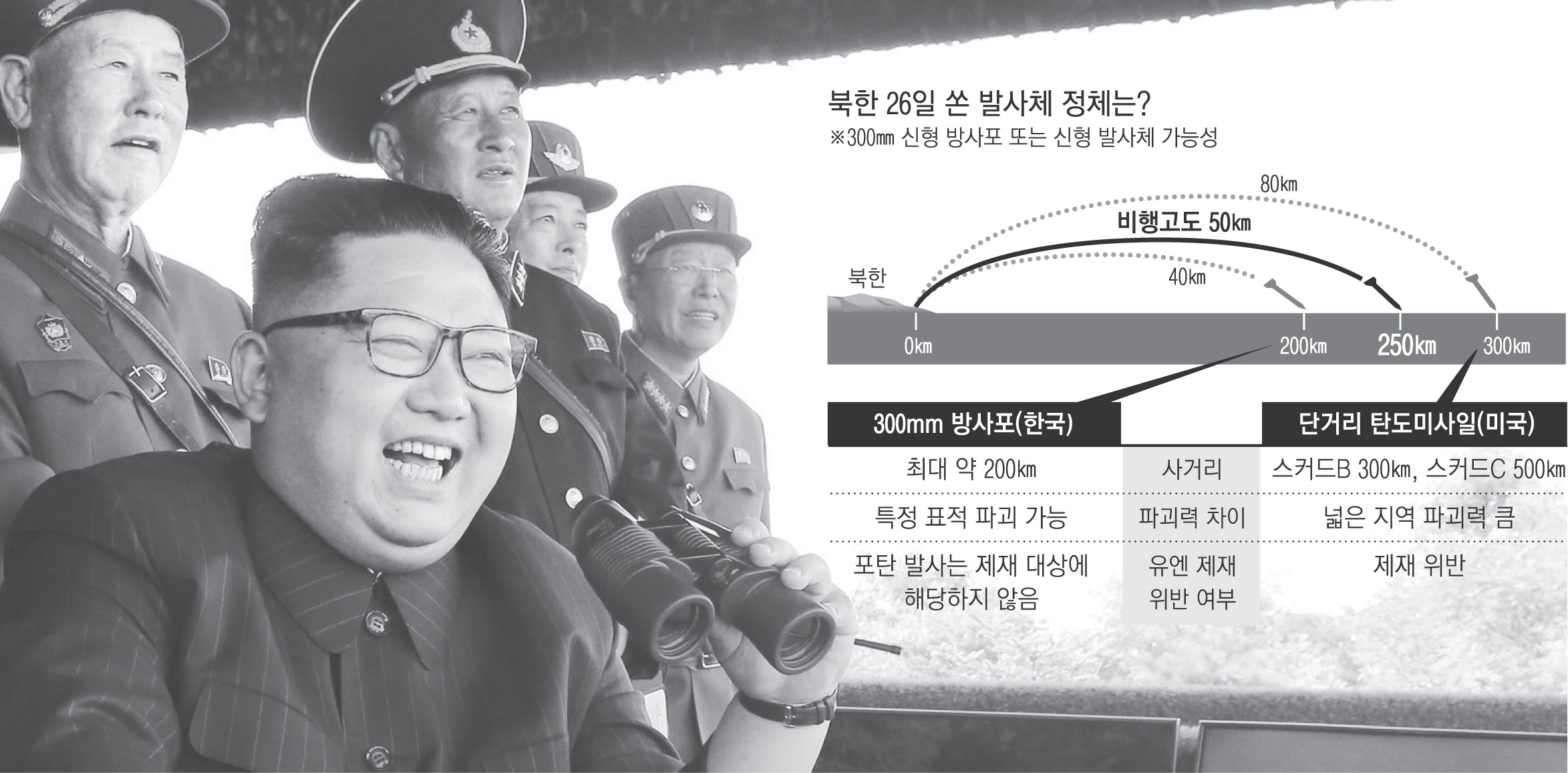 북한이 지난 26일 쏜 단거리 발사체를 두고 한·미 양국 평가가 엇갈리고 있다. 윤영찬 청와대 국민소통수석은 서면 브리핑에서 “북한의 발사체는 개량된 300㎜ 방사포로 추정되나 정확한 특성과 재원에 대해서는 군 당국이 정밀 분석 중”이라고 밝혔다. 방사포는 대구경 다연장로켓포(MLRS)의 북한식 표현이다. 앞서 미국 태평양사령부는 “초기 분석 결과는 3발의 단거리 탄도미사일 발사”라고 평가했다.