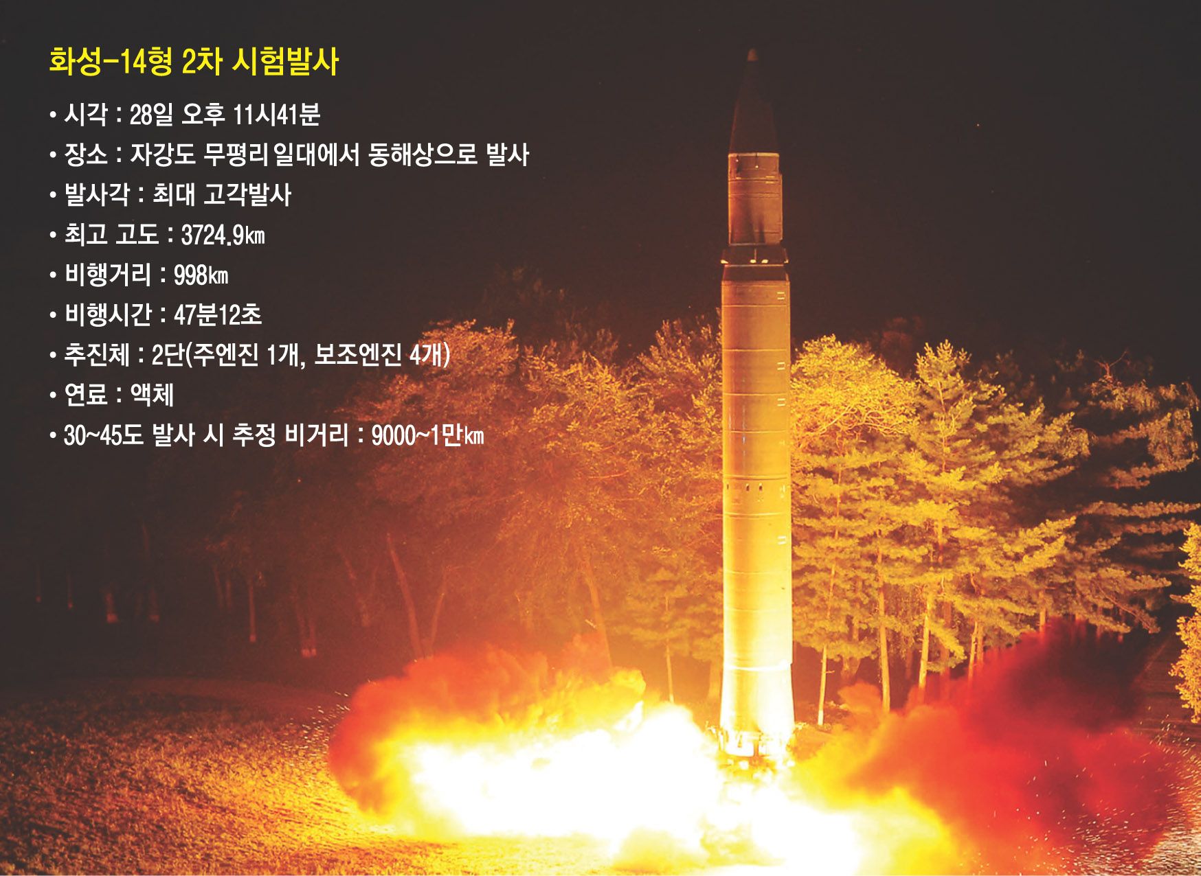 북한은 2017년 7월 28일 밤 기습 발사한 대륙간탄도미사일(ICBM)급 미사일에 대해 ‘화성-14형 2차 시험발사’라고 조선중앙통신을 통해 밝혔다. 지난 4일 쏜 ICBM급과 같은 종류임을 확인한 것이다. 북한은 1차 때와 마찬가지로 화성-14형을 좌우 각각 8개 바퀴를 단 차량형 이동식 발사대로 옮겨 지상 발사대에 거치한 뒤 쏜 것으로 확인됐다.