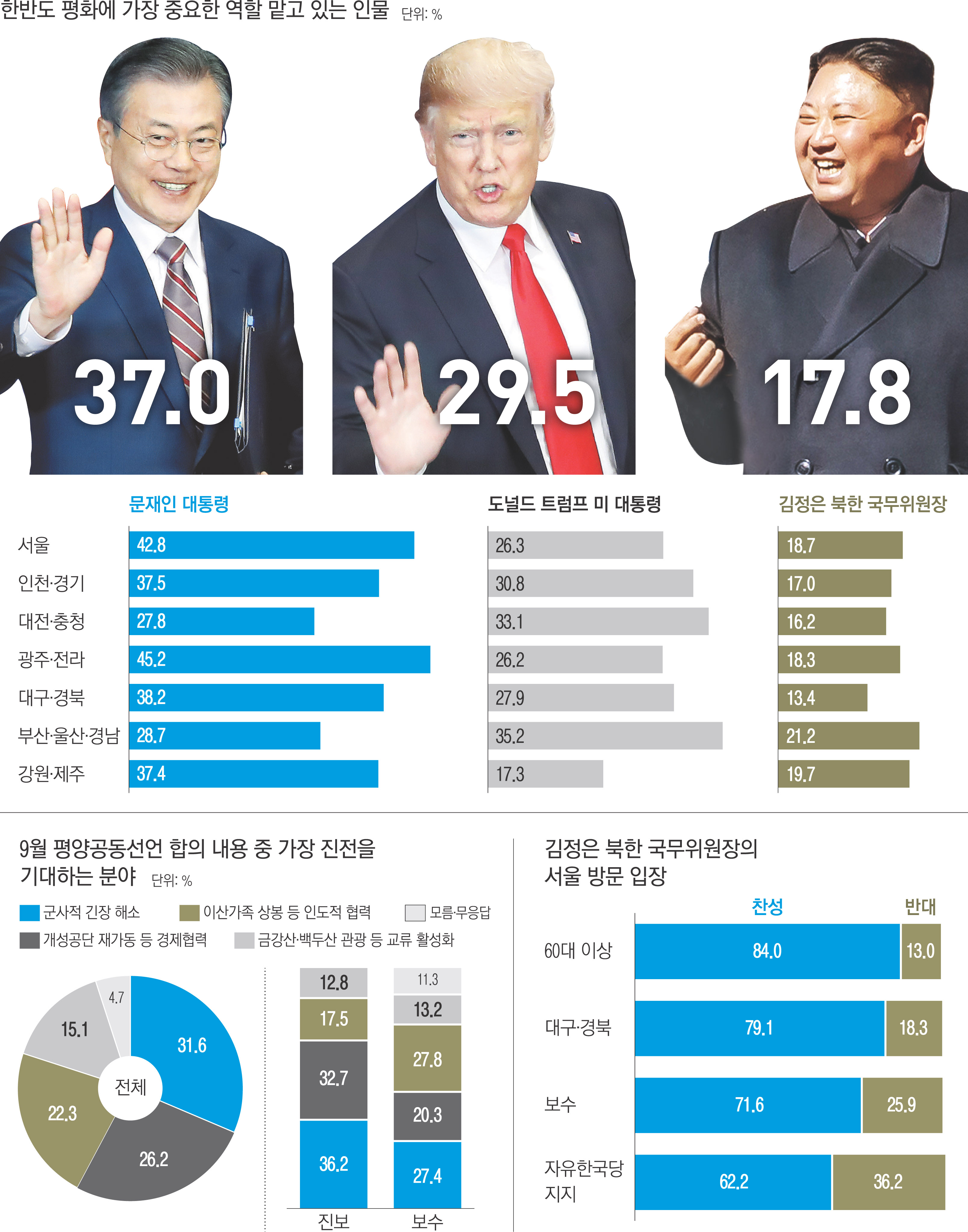 북한에 적대적인 성향으로 분류돼 왔던 60세 이상 연령층과 대구·경북 지역, 보수층에서도 한반도 평화 관련 주요 이슈에서 청년·진보층과 크게 다르지 않은, 높은 기대감을 보이고 있는 것으로 나타났다. 특히 김정은 북한 국무위원장의 서울 방문에 대해서는 연령대·거주 지역·이념성향·지지정당을 막론하고 찬성 여론이 반대 여론을 압도했다. 올 들어 세 차례에 걸쳐 이뤄진 남북정상회담과 교착 상태를 풀어가고 있는 북·미관계 등이 영향을 준 것으로 풀이된다. 그간 한반도 평화의 발목을 잡아왔던 ‘남남갈등’의 완화 징후가 나타나고 있는 것으로도 평가된다.