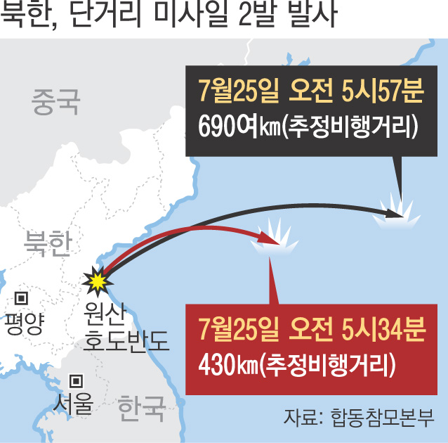 북한이 25일 동해상으로 단거리 미사일 2발을 발사했다. 북한이 단거리 미사일을 시험발사한 것은 지난 5월9일 이후 77일 만이다. 지난달 30일 판문점 북·미 정상회담 이후 첫 ‘무력시위’를 한 것이다. 다음달 5일부터 실시되는 한·미 연합훈련에 대응하면서 미국을 압박하려는 의도로 풀이된다.