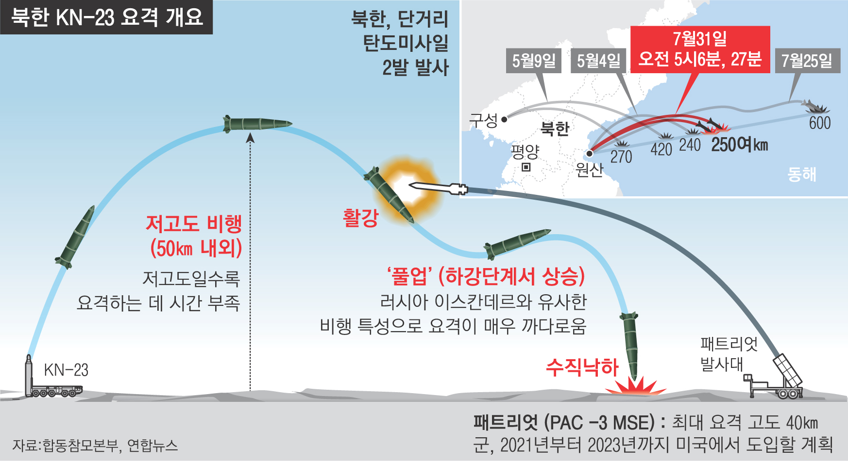 북한이 31일 강원 원산 갈마 일대에서 동해상으로 단거리 탄도미사일 두 발을 발사하면서 엿새 만에 다시 무력 시위를 했다. 이번 미사일은 지난 25일 발사한 ‘북한판 이스칸데르’(KN-23)와 유사한 것으로 군 당국은 추정한다. 특히 저고도 발사로 남측의 방공체계를 무력화할 수 있다는 점을 부각하면서 대남·대미 압박의 강도를 높인 것으로 풀이된다.