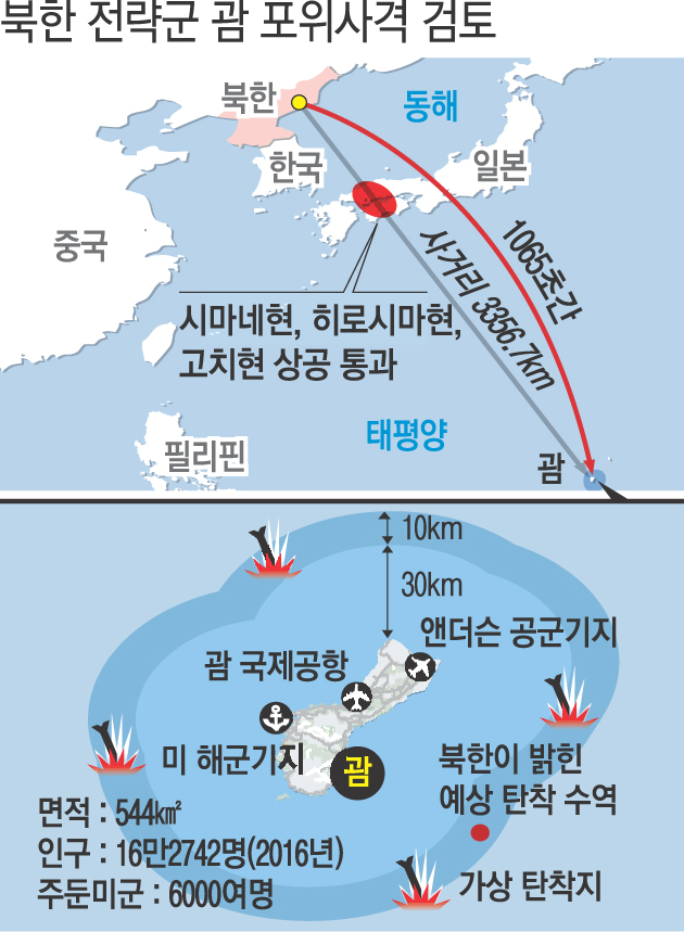 북한군 전략군은 중장거리탄도미사일(IRBM)인 ‘화성-12’형 4발로 미군 기지가 있는 괌을 포위사격하는 방안을 검토 중이라고 10일 밝혔다. 북한은 미사일 포위사격의 목표와 궤적, 실행시점 등을 상세히 공개했다. 전날 도널드 트럼프 미국 대통령의 ‘화염과 분노’ 발언에 대해 북한이 김정은 정권 출범 이후 가장 높은 수준의 구체적 대미 위협으로 답한 것이다.