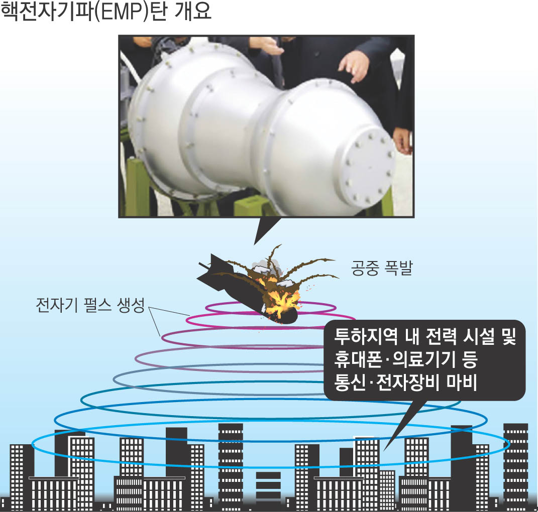 북한이 핵전술 고도화를 위해 핵탄두 폭발 과정에서 발생하는 핵 전자기파(EMP) 폭탄을 이용한 공격 능력을 지속적으로 높이고 있다는 것이 6차 핵실험에서 확인됐다. 북한은 대륙간탄도미사일(ICBM) 장착용 수소폭탄으로 초강력 핵 EMP 공격을 가할 수 있다고 주장한 데 이어 4일 노동당 기관지 노동신문을 통해 EMP 공격의 원리와 위력을 소개하는 형식으로 한·미를 위협했다.
