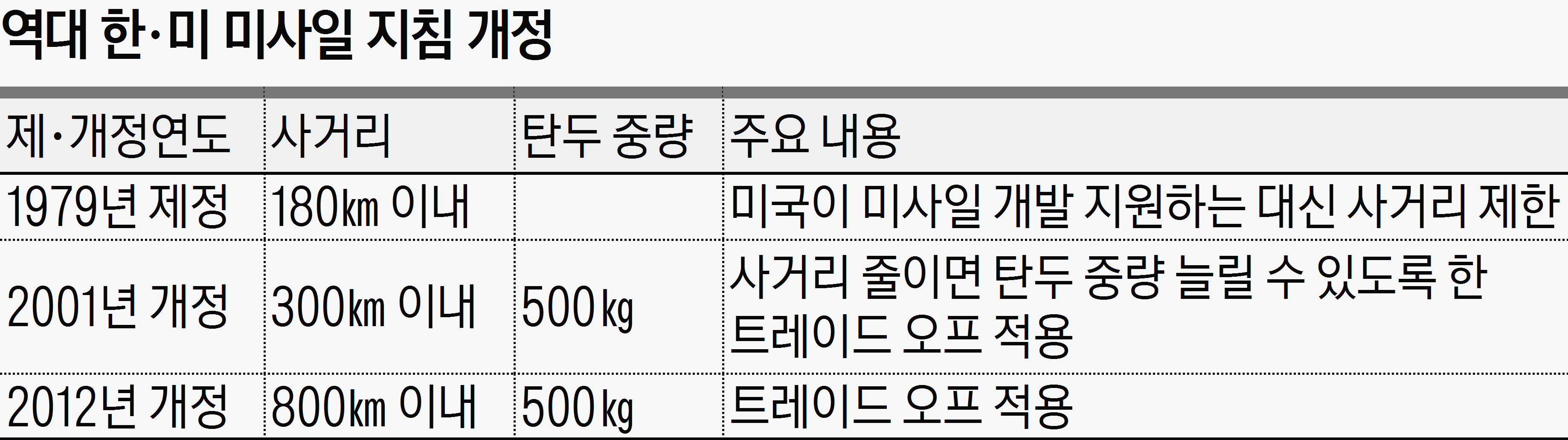 문재인 대통령과 도널드 트럼프 미국 대통령이 2017년 9월 4일 한·미 미사일지침의 탄두중량 제한을 해제하기로 합의한 것은 한국군의 독자적 미사일 타격 능력이 크게 향상됨을 의미한다. 당초 양국 대통령은 사거리 800㎞ 미사일의 탄두중량 제한을 500㎏에서 2배인 1t 수준으로 높일 것으로 전망됐지만, 제한 자체를 아예 없애 한국군은 얼마든지 탄두중량을 늘리는 게 가능해졌다.