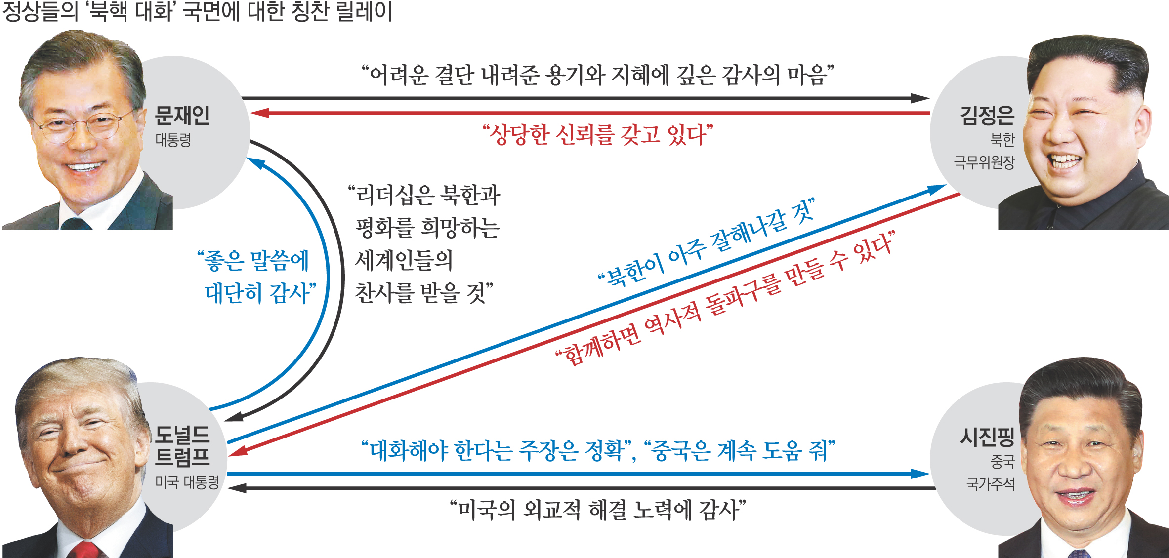 한반도 주변국 정상들의 칭찬과 덕담 릴레이가 이어지고 있다. 북핵 긴장 국면이 대화와 외교 국면에 들어섰음을 보여준다는 평가가 나온다. 올해 초만 해도 ‘말 폭탄’을 쏟아냈던 도널드 트럼프 미국 대통령과 김정은 국무위원장이 북·미대화에 대한 덕담을 주고받고 있다.