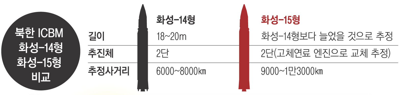 군 당국은 북한이 2017년 11월 29일 새벽 시험발사한 대륙간탄도미사일(ICBM) ‘화성-15형’은 신형 미사일로 평가된다고 11월 30일 밝혔다. 1단 추진체에 2개의 엔진이 장착되고 외형과 크기가 달라지는 등 기존의 ‘화성-14형’과 차이가 큰 것으로 확인됐다.