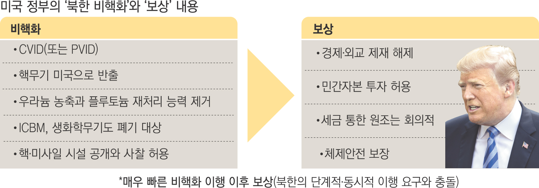 북·미 정상회담 준비가 속도를 내면서 핵심 쟁점인 한반도의 완전한 비핵화에 대한 도널드 트럼프 미국 정부의 입장도 조금씩 구체화되고 있다. 트럼프 정부는 김정은 북한 국무위원장의 비핵화 결단 가능성에 기대감을 표하면서도 비핵화 방식을 두고는 북한과 분명한 입장 차를 보이고 있다.