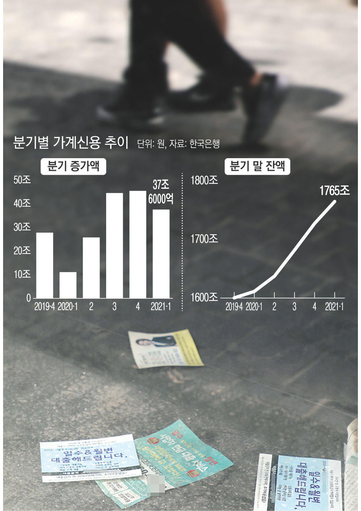 당국의 대출 규제 움직임에도 올 1분기 가계신용이 37조6000억원이나 늘며 가파른 증가세가 지속된 것은 코로나19 사태로 어려움을 겪는 계층의 생계자금, 부동산 관련 자금 수요가 여전히 많다는 뜻으로 풀이된다.