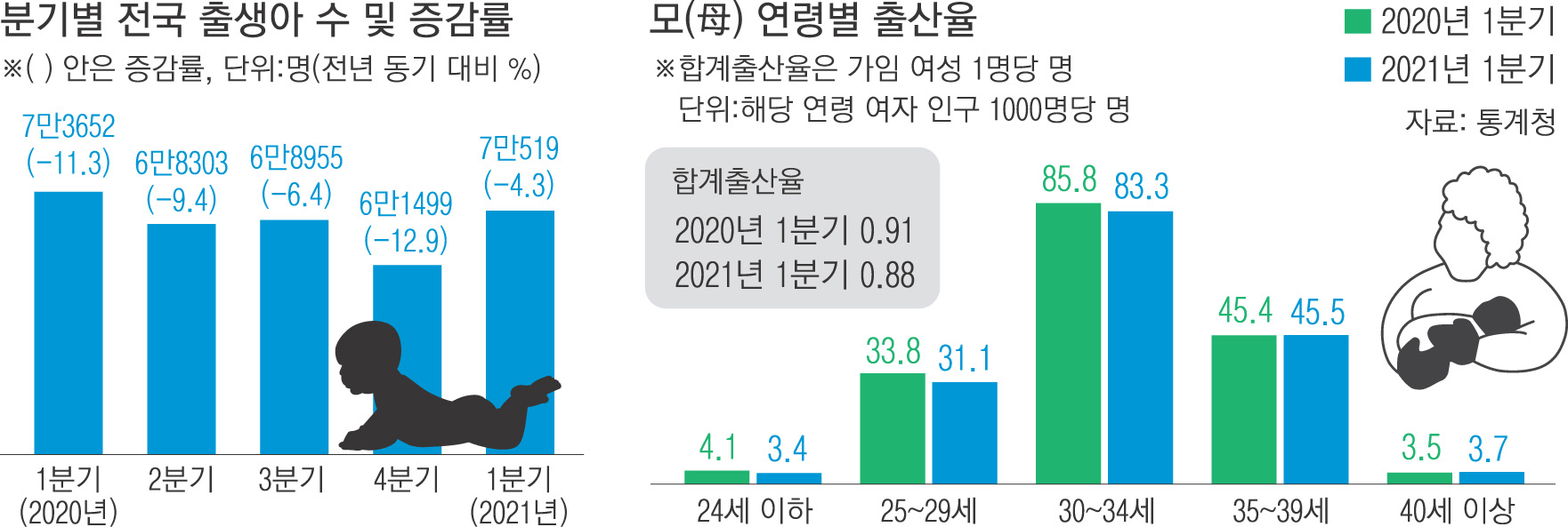 올해 1~3월(1분기) 출생아 수가 1분기 기준 역대 최소 기록을 쓰면서 합계출산율이 0.88명으로 떨어졌다.