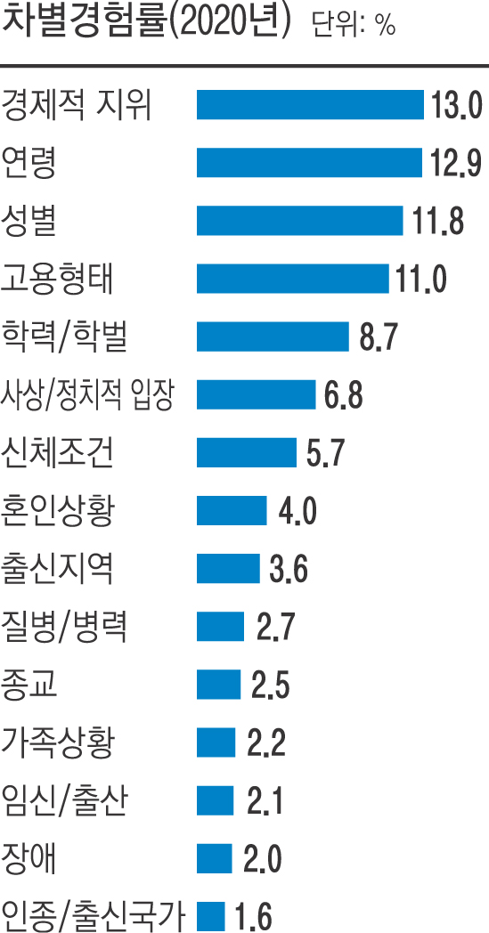 국가인권위원회가 실시한 ‘국가인권실태조사’에 따르면 2020년 전체 13%에 달하는 국민이 경제적 지위 때문에 차별을 당한 경험이 있다고 답했다.