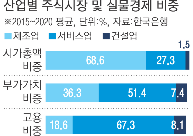 국내 주식시장이 제조업 중심으로 구성돼 있어 서비스업을 포함한 실물경제와 동떨어진 흐름을 보이고 있다는 분석이 나왔다.