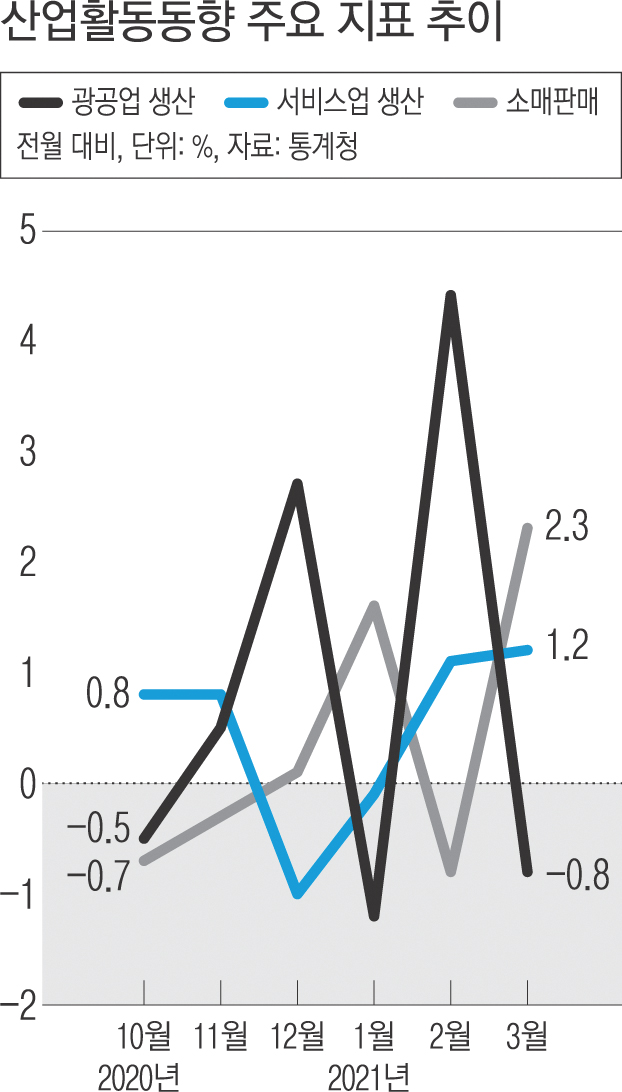 차량용 반도체 수급 등의 문제로 광공업 생산이 주춤했지만 서비스업 생산이 늘며 전 산업생산이 두 달 연속 증가세를 이어간 것으로 나타났다.