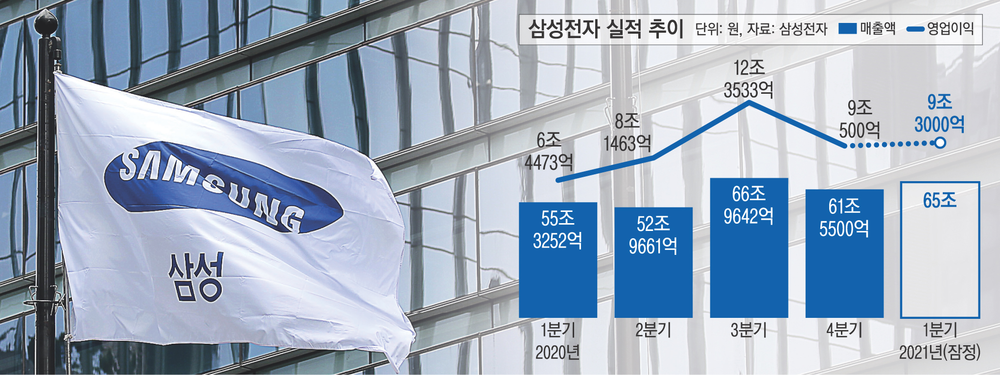 삼성전자가 올 1분기에 기록한 65조원의 매출액은 역대 최대였던 지난해 3분기(66조9642억원)에 버금가는 수준으로 1분기 기준으로는 역대 최대치다.