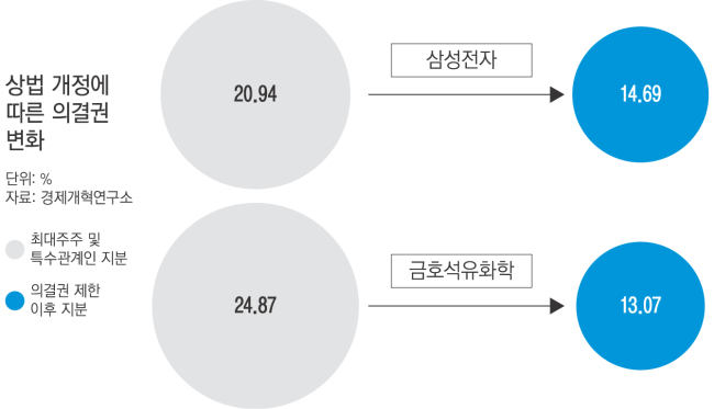 1일 현재 개정 상법 적용이 유력한 대기업은 금호석유화학과 삼성전자 두 곳이다. 배임 횡령 등으로 총수가 유죄 판결을 받은 금호석유화학은 4명의 감사위원 중 올해 2명의 임기가 만료된다. 상법은 감사위원회를 3명 이상의 이사로 구성하도록 한 만큼 최소 1명 이상의 사외이사 선임을 해야 한다. 3분기 공시를 보면 금호석유화학은 최대주주 및 특수관계인이 24.87%의 의결권을 보유하고 있다. 그러나 상법 개정으로 총수일가 의결권은 개인마다 3%로 제한됨에 따라 13.07%로 줄어든다. 최근 박찬구 금호석유화학 회장의 조카인 박철완 상무가 독자적인 주주권 행사를 예고하면서 박 회장이 지지하는 감사위원이 선출되지 않을 가능성은 더 높아졌다.
