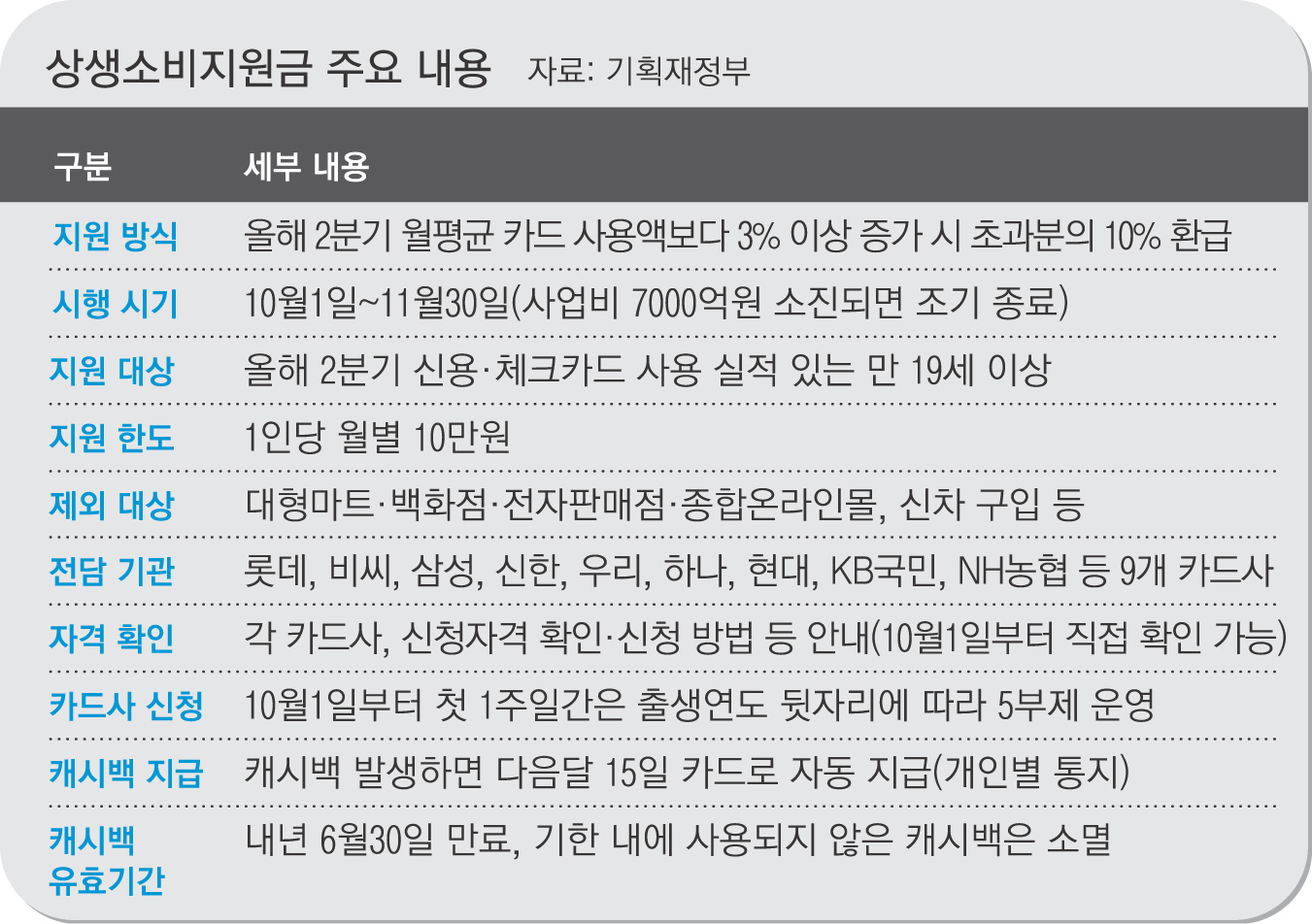 10월 소비분부터 적용되는 카드 캐시백은 신용·체크카드(법인카드 제외)를 올 2분기(4∼6월) 월평균 사용액보다 3% 이상 많이 쓰면 초과분의 10%를 월 10만원까지 환급해주는 정책이다.
