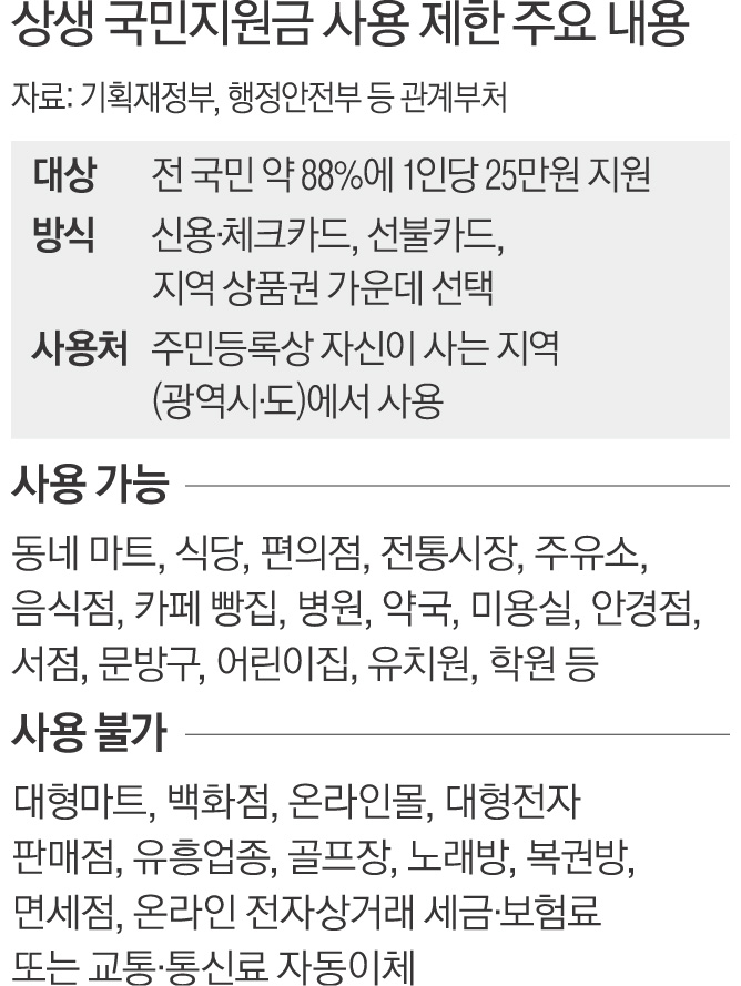 추석 이전에 국민 약 88%에게 지급될 예정인 상생 국민지원금은 동네마트에서는 사용이 가능한 반면 백화점이나 대형마트 등에서는 쓸 수 없을 것으로 보인다.