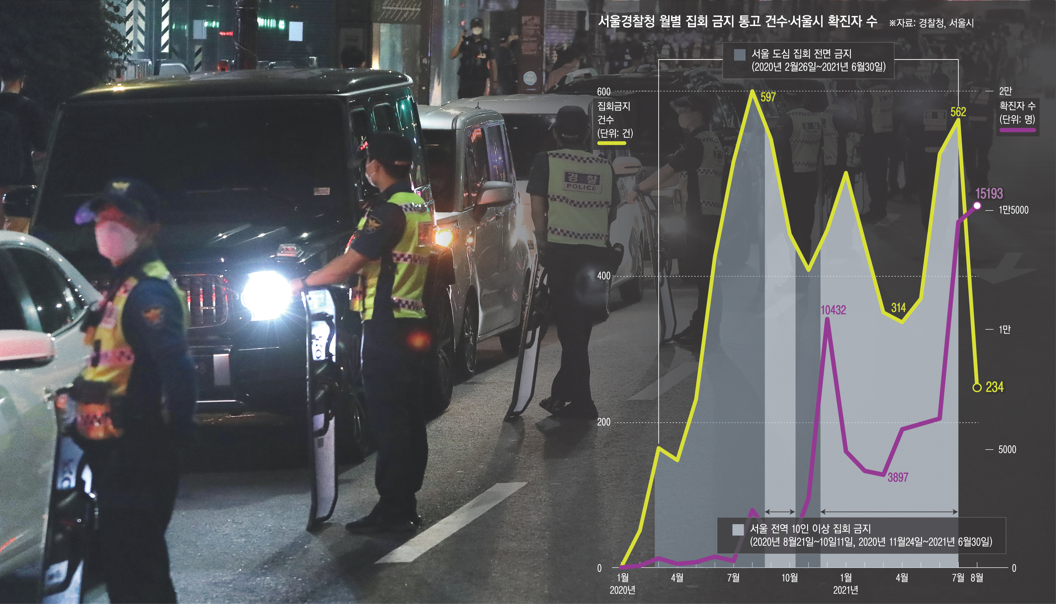 코로나19 첫 확진자가 나온 지난해 1월 이후 지난 8월까지 1년8개월간 집회 신고 대비 금지 통고 비율(금지율)은 12.1%에 달한다.