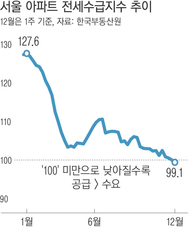 전세를 구하려는 수요보다 세입자를 찾는 집주인이 많아지면서 서울 아파트 전세수급지수가 약 2년2개월 만에 100 이하로 떨어졌다.