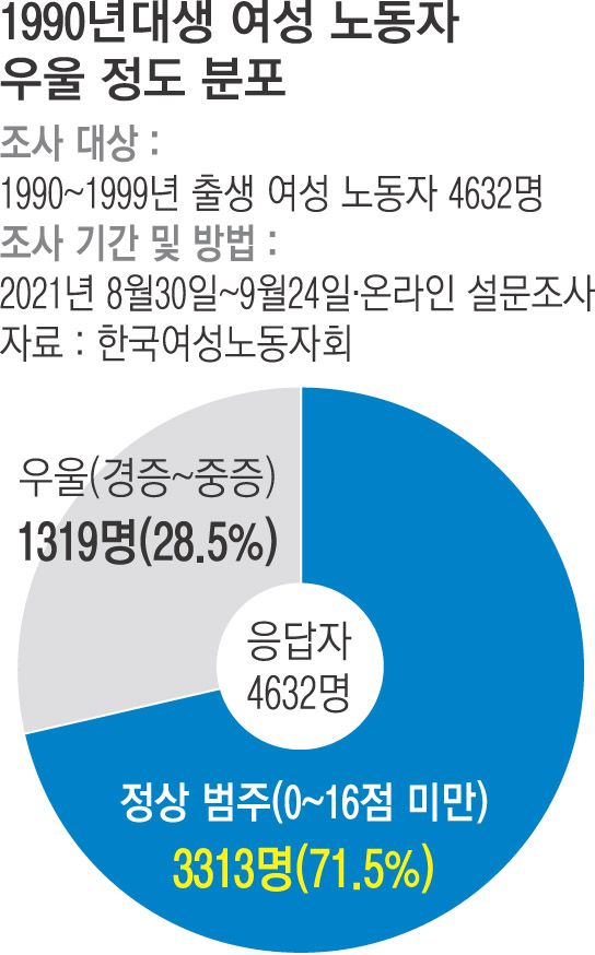 1990년대생 여성 노동자 100명 중 28명꼴로 우울 증상을 겪고 있다는 조사 결과가 나왔다.