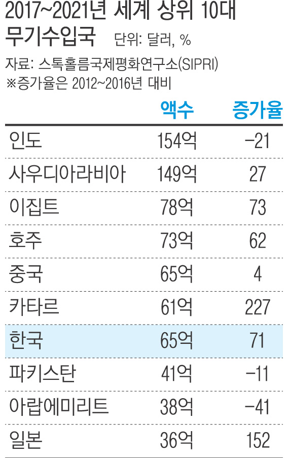스웨덴의 스톡홀름국제평화연구소(SIPRI)는 2017~2021년 전 세계 무기 거래량을 분석한 보고서를 14일(현지시간) 발표했다.