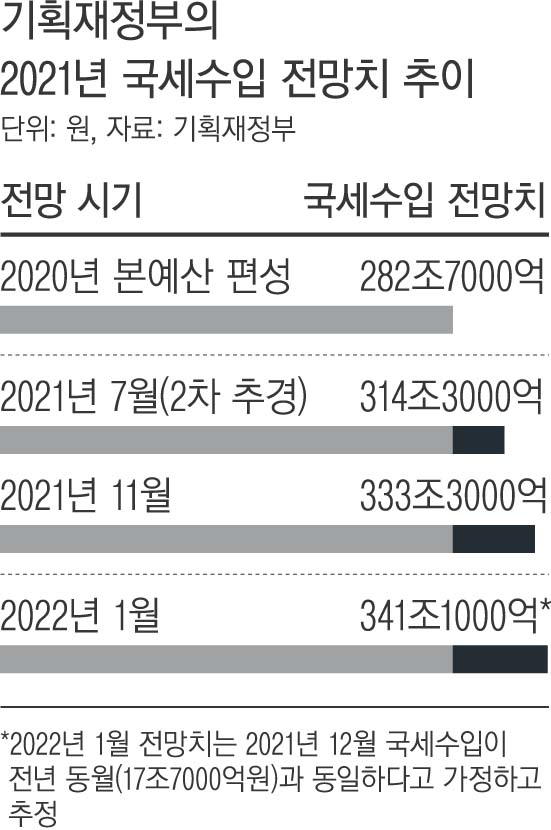 국세수입 전망치는 282조7000억원(2020년 가을)→314조3000억원(지난해 7월)→333조3000억원(지난해 11월)→341조1000억원(올해 1월)으로 계속 높아져 왔다.