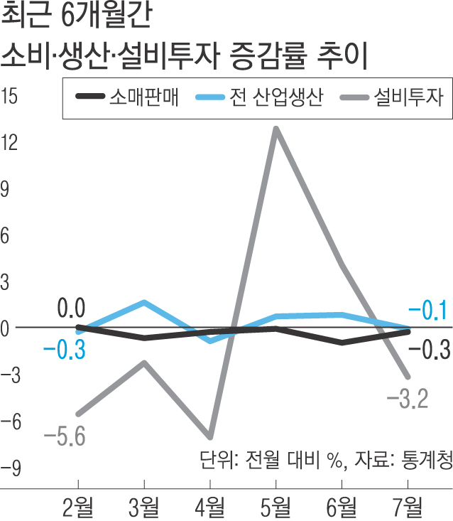 소비 동향을 보여주는 소매판매액 지수가 통계 작성 이래 처음으로 5개월 연속 감소했다. 지난달 생산과 투자 지표도 일제히 줄어들어 소비·생산·투자가 모두 감소하는 ‘트리플 감소’ 현상이 3개월 만에 나타났다.