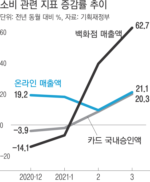 국내 카드 승인액과 백화점 매출액이 큰 폭으로 늘어나는 등 민간소비가 살아나는 모습을 보이면서다.