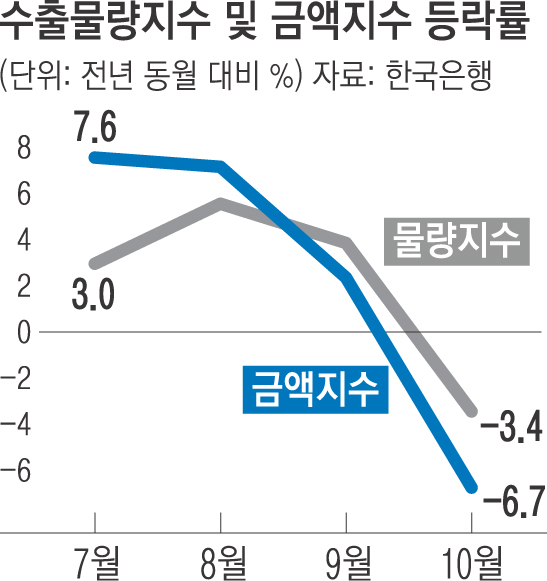 반도체 가격 하락 등의 영향으로 지난 10월 수출금액지수가 2년 만에 하락전환했다.