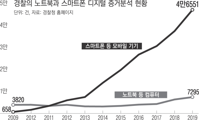 2019년 경찰청이 전국에서 압수해 분석한 전자정보기기를 보면 스마트폰 등 휴대전화가 전체의 82.4%(4만6551건), 노트북 등 컴퓨터가 12.9%(7295건)이다.