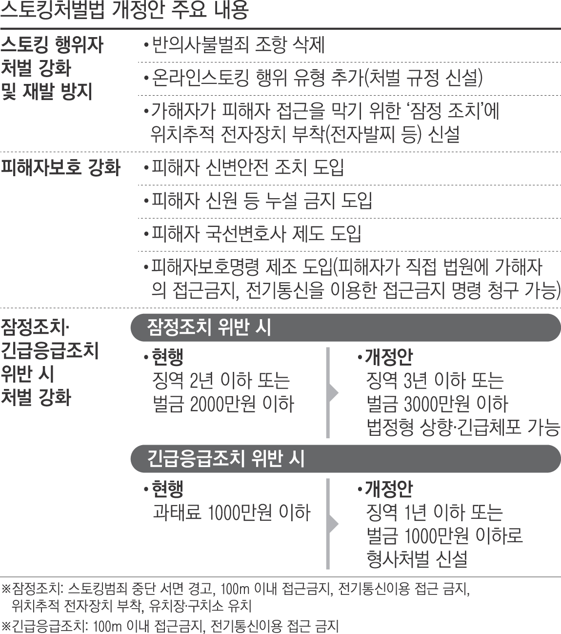 스토킹 재범 배경 중 하나였던 스토킹처벌법의 ‘반의사 불벌’ 조항은 폐지하기로 했다.