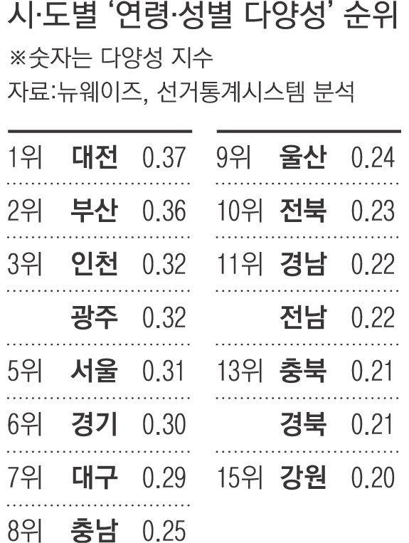 반면 성별·연령별 다양도가 가장 낮은 곳은 강원도였다.