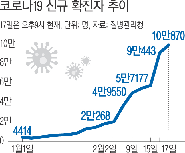 코로나19 신규 확진자가 처음으로 10만명대로 늘어났다.