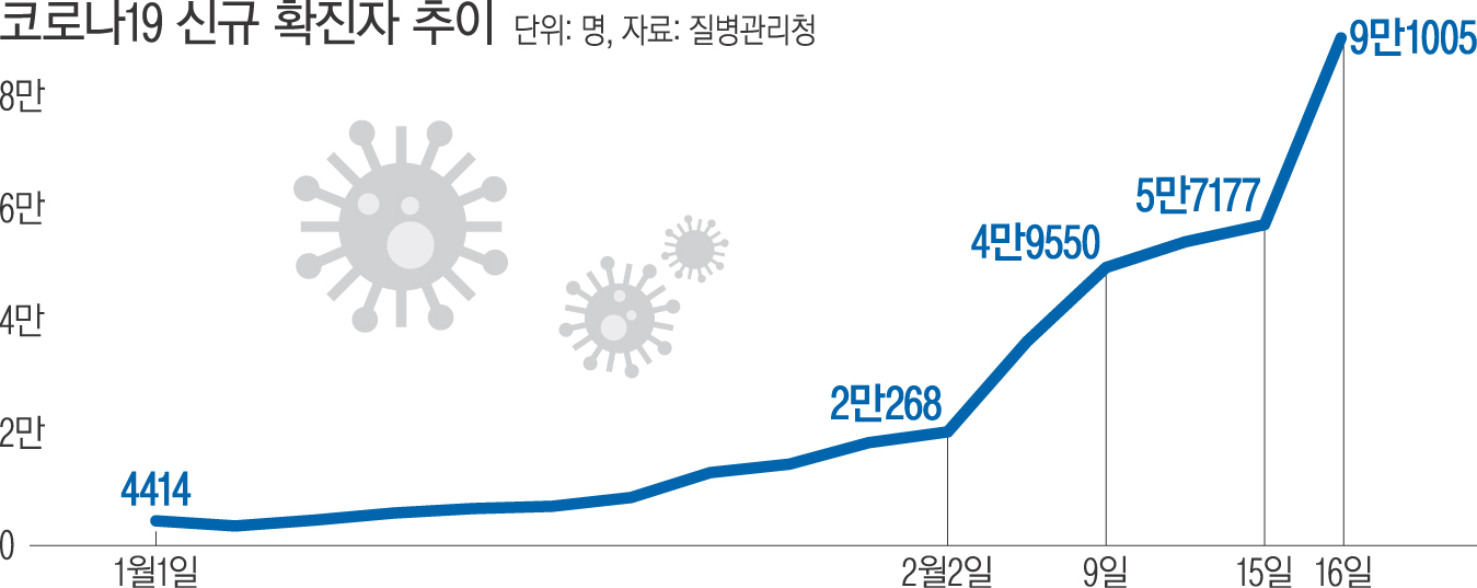 16일 신규 확진자는 9만433명으로 일주일 전인 지난 9일(4만9550명)보다 1.8배 늘어났다.