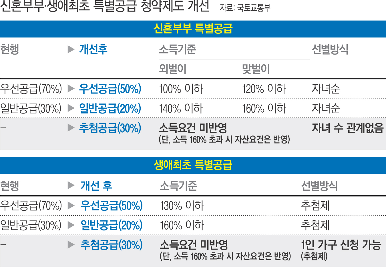 국토교통부는 8일 ‘청년특별대책 당정협의회’의 후속 조치로 현행 생애최초·신혼부부 특별공급 제도를 일부 개편해 11월부터 시행한다고 밝혔다.