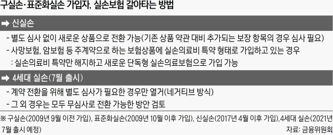 전문가들은 구실손(2009년 9월 이전 가입), 표준화실손(2009년 10월~2017년 3월 가입) 가입자의 경우 보험도 유지하면서 보험료도 절약할 수 있으므로 섣불리 계약을 해지하지 말라고 조언한다. 2017년 4월 출시된 신실손으로 갈아타거나, 오는 7월 출시되는 4세대 실손을 기다려볼 수 있다. 보장 내역과 보험료 할인폭을 비교해 가입자 스스로 어떤 보험으로 갈아탈지 결정하는 것이 좋다.