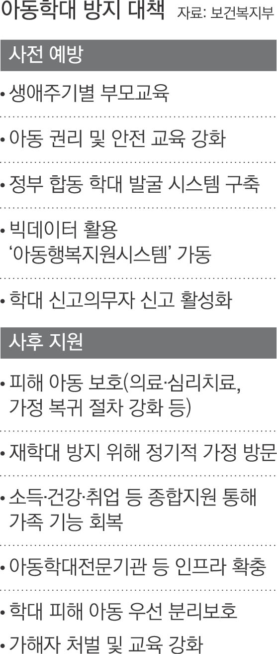 정부는 올해 57곳으로 확대될 예정이었던 아동보호전문기관(현재 55곳)을 연내 2~3곳 추가 설치하고 인력도 기관별로 2명가량 증원할 계획이다. 그러나 아동보호전문기관의 증가폭이 보건복지부가 지난해 예산 편성 당시 요구했던 수준(24곳 추가)에 미치지 못하고, 다른 복지시설에 비해 낮은 인건비(연 2600만원)도 개선되지 않았다. 생애주기별 부모교육도 학교·보건소·산부인과 등이 예비부모·학부모 등에게 교육 과정을 ‘안내’하거나 교육 이수를 ‘권고’하는 정도에 그치고 있어 실효성에 의문이 제기된다.