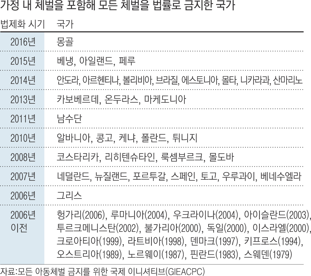 가정 내 체벌을 포함해 모든 체벌을 법률로 금지한 국가