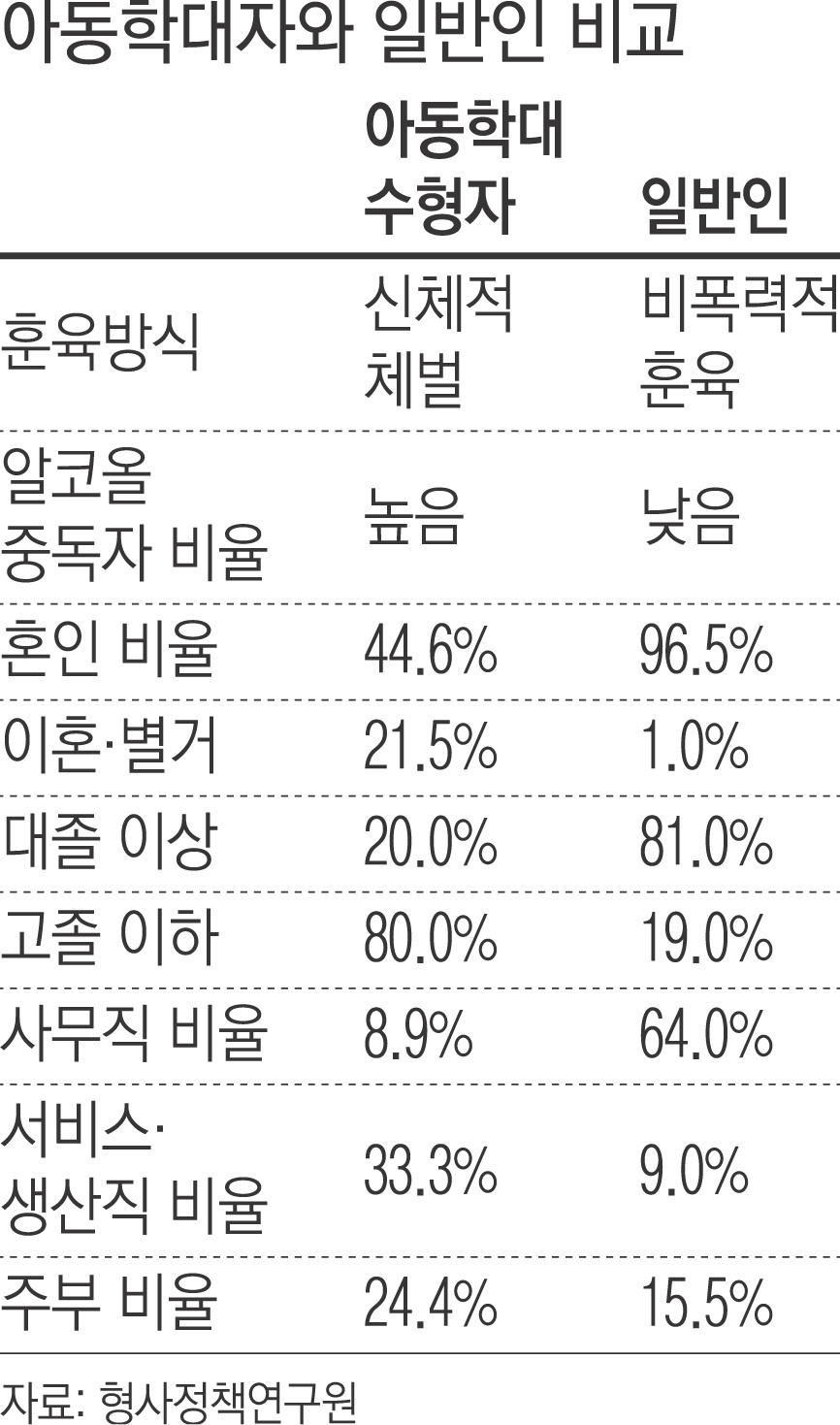 형사정책연구원이 전국에 수감된 65명의 아동학대 가해자들의 특성을 분석한 결과 53.1%가 살인죄로 기소됐다. 폭행치사 등 피해자를 숨지게 한 경우는 전체의 76.5%였다. 수감자들의 78.5%는 자신의 집 또는 피해자의 집에서 범행을 저질렀다. 공원이나 산 등 실외에서 아동학대가 일어난 경우는 전체의 9.2%였다. 수감자의 41.5%는 도구를 사용해 아동을 학대했다. 범행 도구로는 흉기(15.4%), 둔기(12.3%)가 많이 사용됐다. 수감자의 36.9%는 손발 등 신체를 사용해 학대를 저질렀다. 아동학대 수감자들은 일반인에 비해 이혼 및 별거 비율이 높았고, 경제 수준은 낮았다. 아이를 훈육할 때도 비폭력적 방식보다는 신체적 체벌을 더 많이 사용한 것으로 조사됐다.