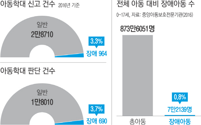 2016년 아동학대 신고는 2만8710건이고, 아동학대로 판단된 경우는 그중 1만8010건에 달한다. 이 가운데서도 가장 방치된 존재가 있다. 바로 학대받는 장애아동이다. 학대를 당한 장애아동은 2016년 기준 690건으로 전체 아동학대 가운데 3.7%를 차지한다. 전체 아동 가운데 장애아동 비율이 0.8%에 불과한 것에 비하면 장애아동의 학대율은 일반 아동에 비해 매우 높다. 하지만 이들은 아동보호시설에서도, 장애인보호시설에서도 환영받지 못해 오갈 데가 없다. 현재 학대 피해 장애아동을 위한 전문 보호시설은 0곳이다. 그 결과 10명 중 8명의 학대 장애아동이 보호시설을 찾지 못해 학대하는 부모가 있는 집으로 돌아온다. 장애아동 학대 재신고율은 2015년 기준 28.5%로 비장애아동의 재신고율 12%의 두 배가 넘는다.