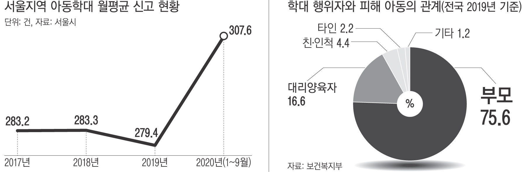 코로나19 확산에 따른 거리 두기 강화로 아이들이 집에 머무는 시간이 많아지면서 신체·정신적인 폭력이나 방치 등 위험에 노출되고 있다. 평소라면 가까이서 챙겼을 교사나 보육시설 종사자들의 시선에서도 멀어지게 됐다. 감염 우려로 학대 의심 가구에 대한 현장조사가 위축되면서 사각지대가 커지는 형국이다. 20일 서울시 집계를 보면, 올해 1월부터 9월까지 접수된 서울지역 아동학대 신고는 2768건에 달한다. 지난해는 3353건이었다. 올해 9월까지 월평균 307.6건 발생해 지난해(279.4건) 수준을 이미 넘어섰다. 교사 등 신고의무자의 신고가 적어진 점까지 감안하면 올해 아동학대 건수는 지난해보다 대폭 늘어날 것으로 보인다.