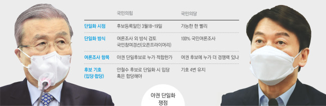 국민의힘과 국민의당이 서울시장 보궐선거 야권 후보 최종 단일화를 두고 2일 신경전에 돌입했다. 전날 안철수 국민의당 대표가 ‘제3지대’ 후보로 확정되고, 국민의힘 후보 선출이 이틀 앞으로 다가오면서 본격적인 샅바 싸움이 시작된 것이다. 양측은 단일화에서 조금이라도 유리한 고지를 점하기 위해 단일화 방식과 후보 기호는 물론, 여론조사 문구 하나하나를 두고도 치열하게 계산기를 두드리고 있다.