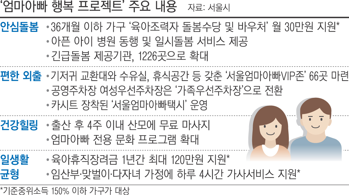 기존 여성우선주차장은 임산부와 영·유아 동반 차량 등을 위한 ‘가족우선주차장’으로 바뀌며, 카시트가 장착된 ‘서울엄마아빠택시’도 운영된다.