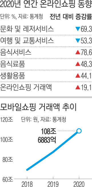 코로나19 감염 우려로 외출을 자제하면서 지난해 온라인쇼핑 거래액이 20% 가까이 증가했다. 모바일 거래액은 처음으로 100조원을 돌파했다.